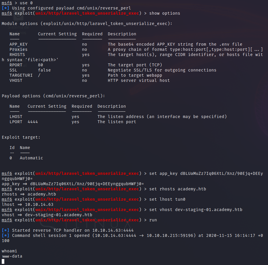 Now we have to set the required options (base64 app_key, virtual host…). When we run the exploit, we get the reverse shell.