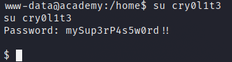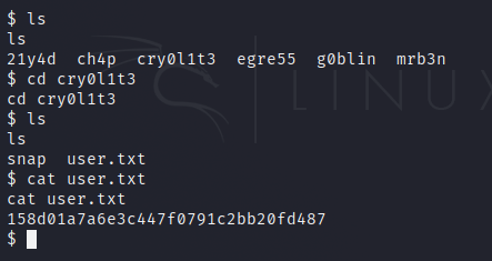 The first step I did was improve the shell as I can log in with the credentials cry0lit3:mySup3rP4s5w0rd !!