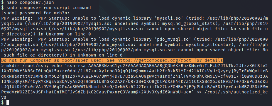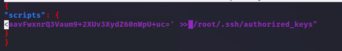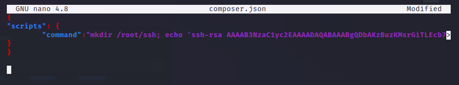 Then, we write a .json script to execute with composer. When executed, this script will include the generated id_rsa to the authorized_keys of the victim machine.