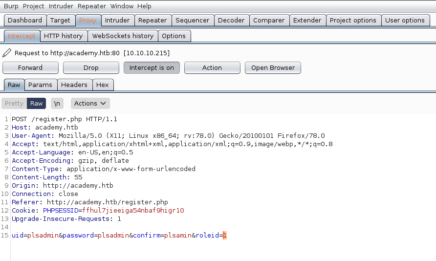 Using burp suite, we try to register again. In the 15th row we can see the attributes for the username and password, but also a “roleid” which is set in 0 by default. We can try to change it to 1 and see if there is any change in the created account