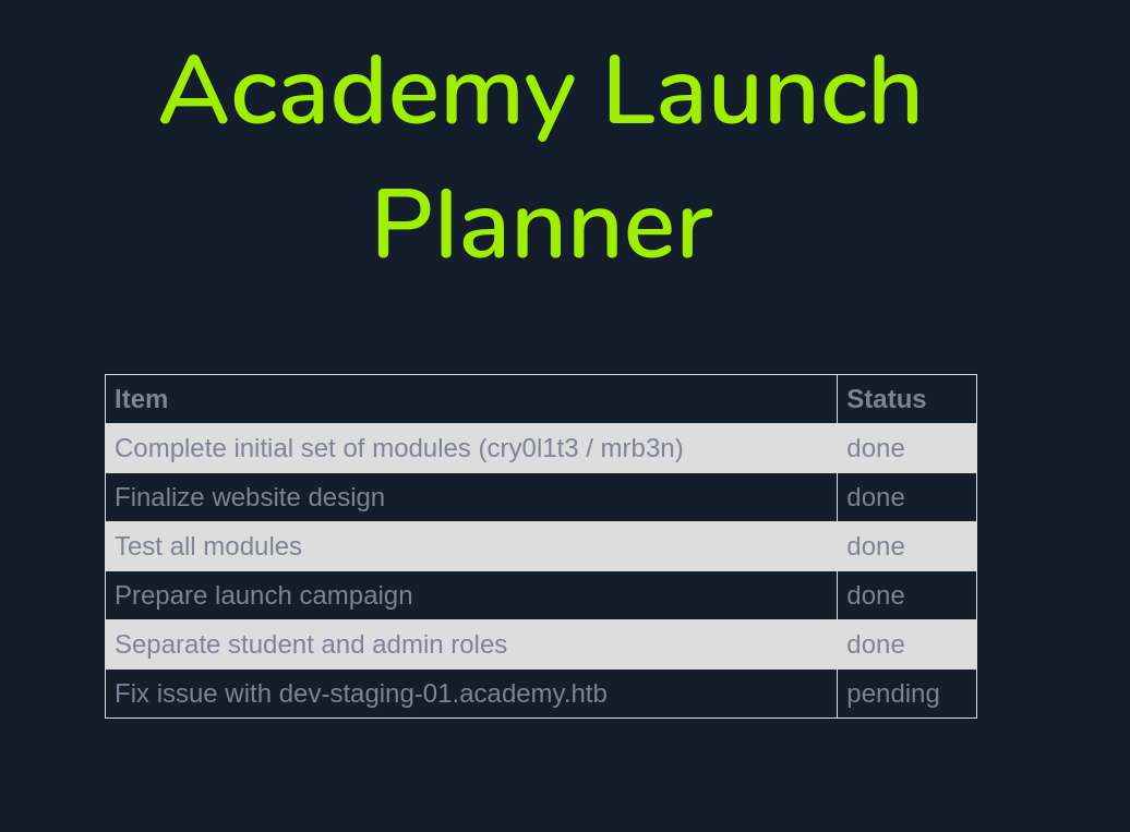 There we find a planner with some tasks of the developers. The “pending” one is relevant, as there is a virtual host hostname, dev-staging-01.academy.htb