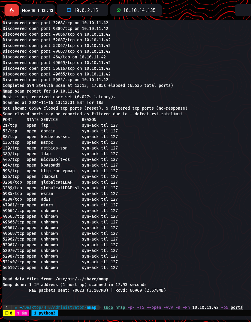 nmap -p- -T5 --open -vv -n -Pn 10.10.11.42 -oG ports