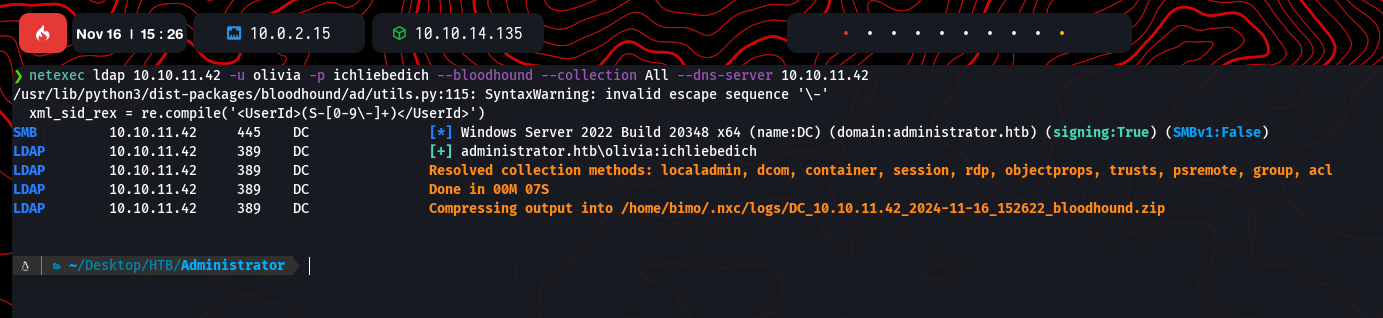 Data was analyzed with BloodHound to identify privilege escalation paths. Using netexec