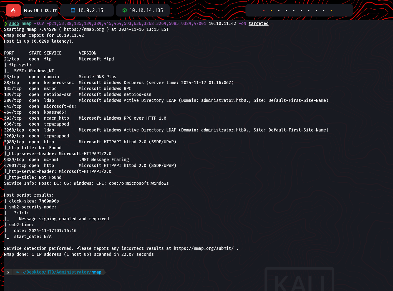 nmap -sCV -p21,53,88,135,139,389,445,593,636,3268,3269,5985,9389,47001 10.10.11.42 -oN targeted