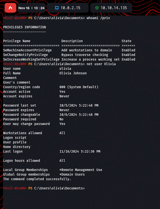 revealed Olivia’s privileges, including SeMachineAccountPrivilege