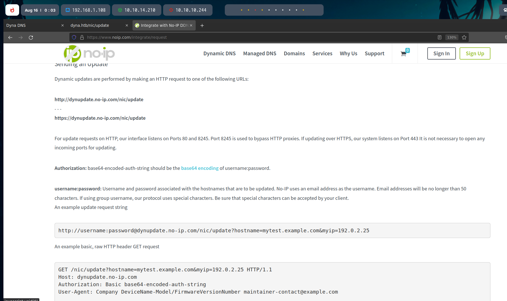 If we investigate about this, we can find a useful no-ip post explaining it. We have to base64 encode the credentials in the request.