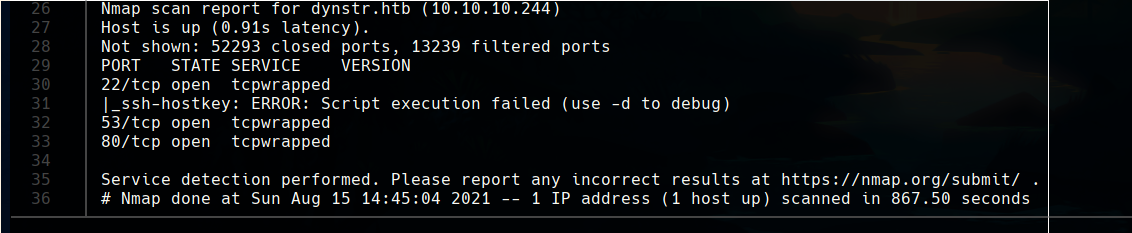 The nmap reports three open ports, 22, 53 and 80.