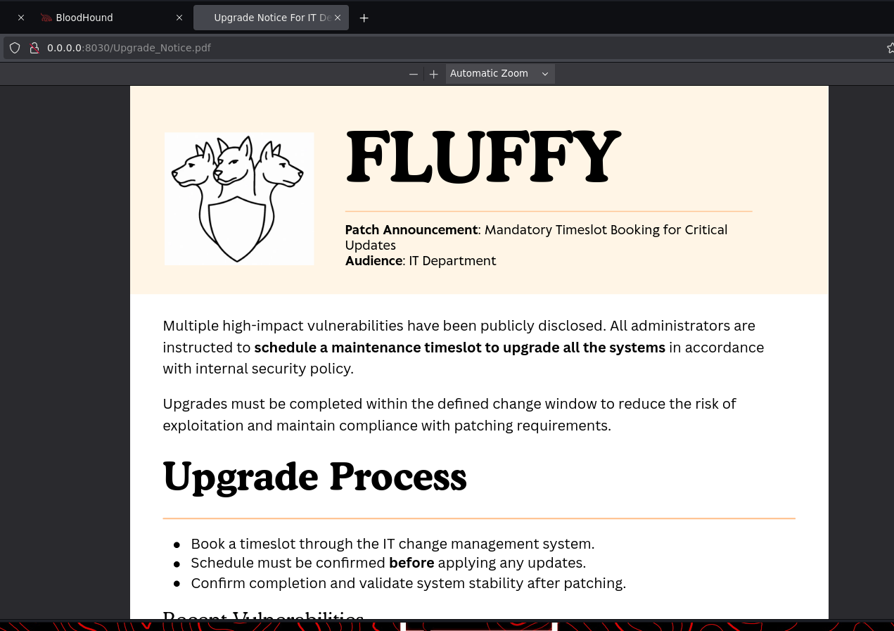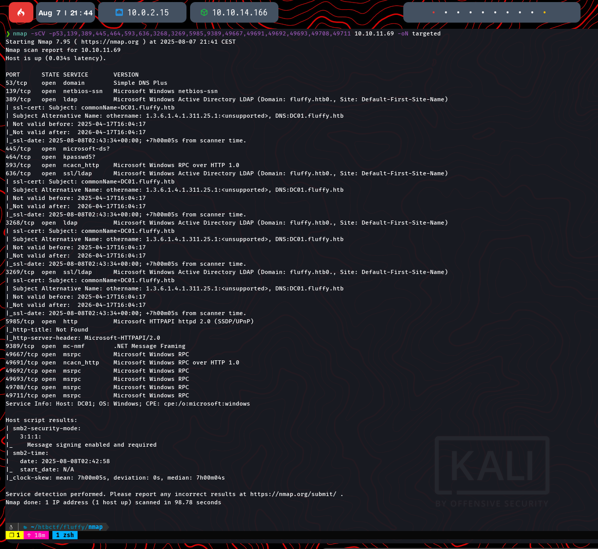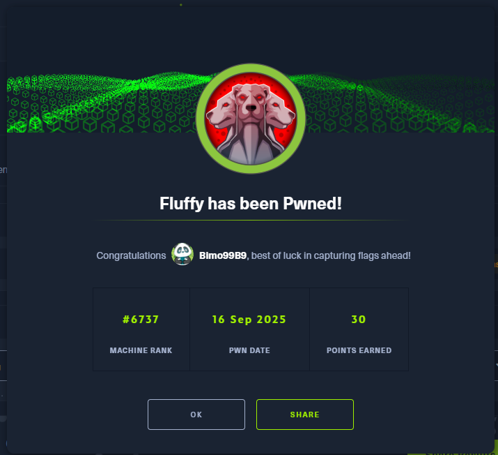 Fluffy is a Windows machine centered on Active Directory exploitation. To gain root access, users must enumerate users and services, exploit Kerberos misconfigurations, and leverage permissions until they become a domain admin.