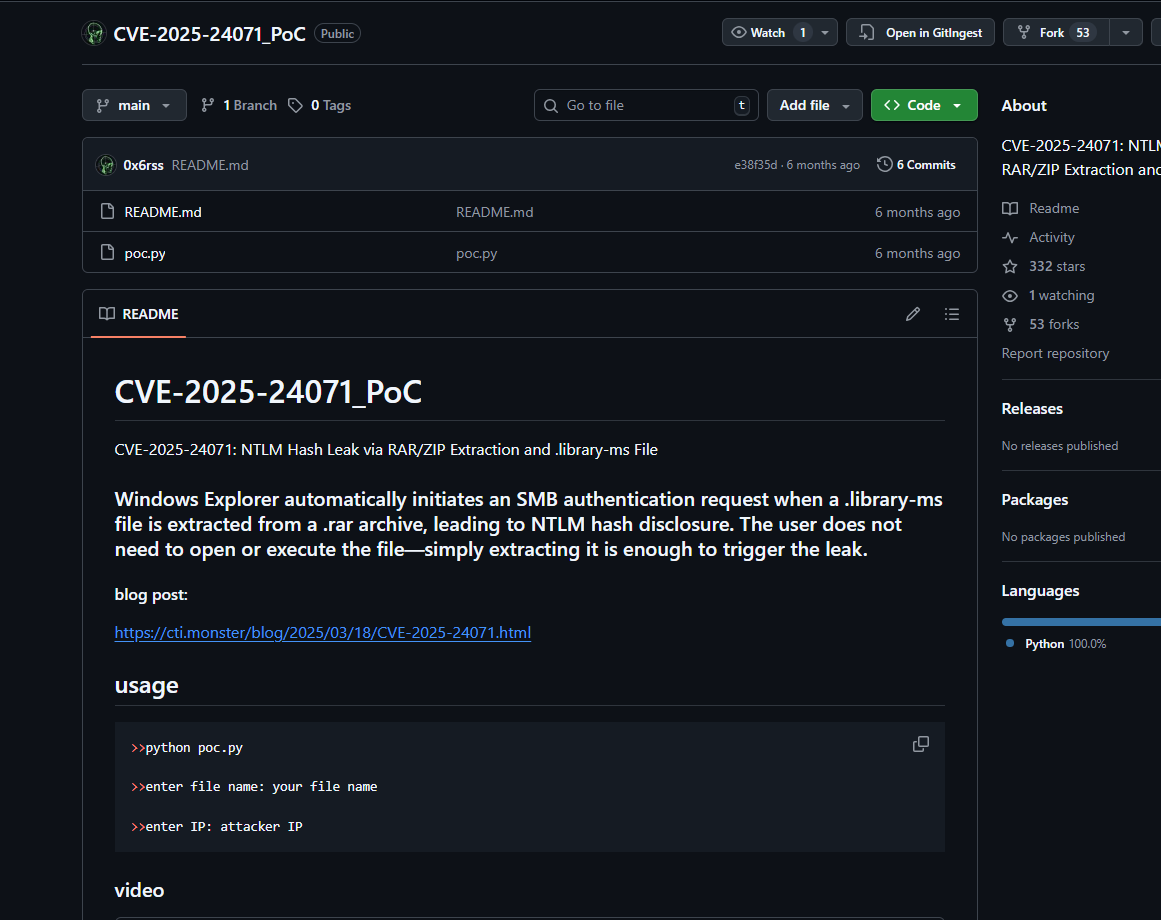 A quick search for this CVE leads to a public Proof of Concept (PoC) on GitHub. The vulnerability allows for NTLM hash leakage when a user simply extracts a malicious ZIP or RAR archive containing a specially crafted .library-ms