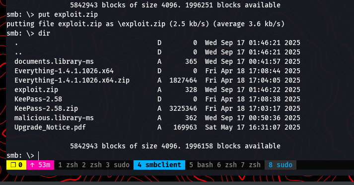 The idea is that an administrator or automated process will eventually scan the new file, extract it to check its contents, and trigger our exploit. After a short wait, our smbserver