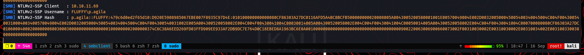 listener captures an incoming connection and provides us with the NTLMv2 hash for the user p.agila