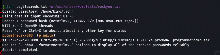 john pagilacreds.txt -w=/usr/share/wordlists/rockyou.txt