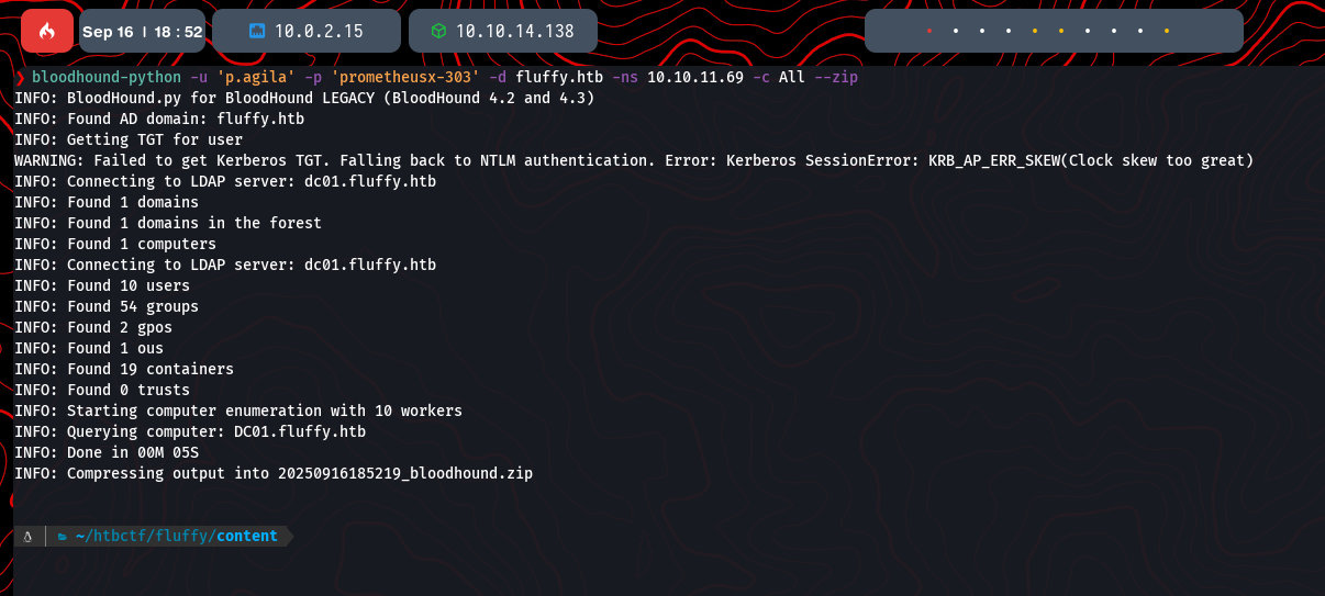 bloodhound-python -u 'p.agila' -p 'prometheusx-303' -d fluffy.htb -ns 10.10.11.69 -c All --zip