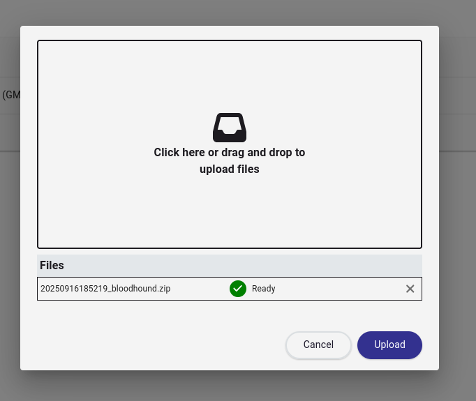 Once the data collection is complete, we upload the new zip file into the BloodHound GUI.