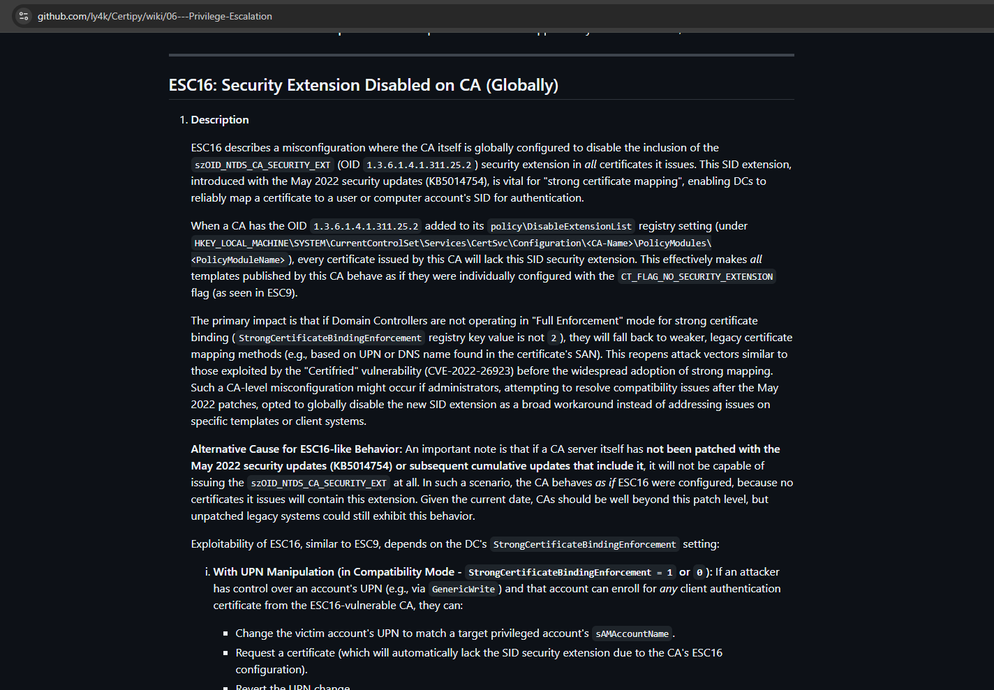 The ESC16 vulnerability occurs when the Certificate Authority has a specific security extension disabled. This allows an attacker with permissions to edit a user’s userPrincipalName