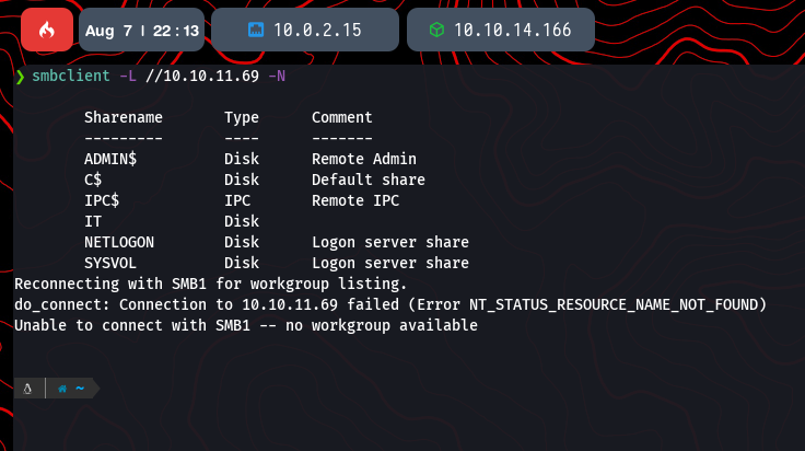 With the hosts file configured, we can start enumerating the exposed services. A good starting point is SMB, as it often allows anonymous listing of shares. We use smbclient