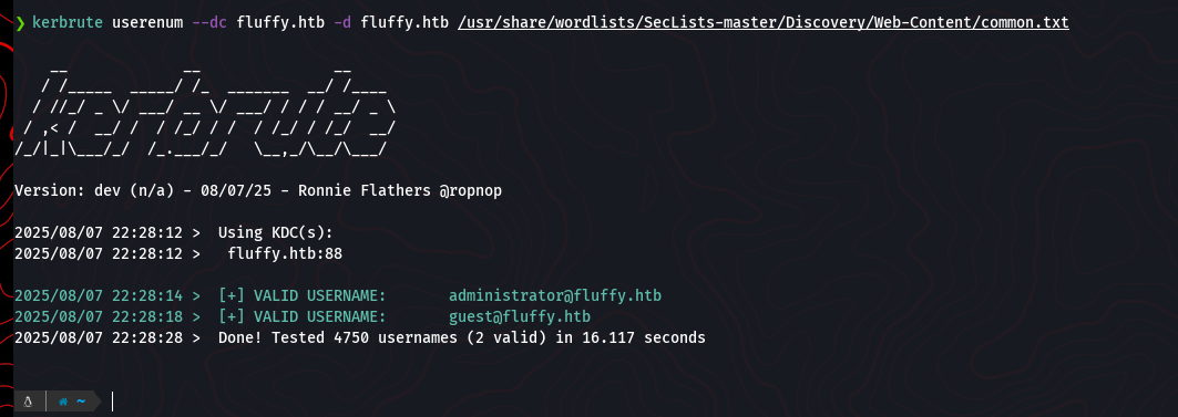 Before diving deeper, we can perform user enumeration against the domain controller using a tool like kerbrute