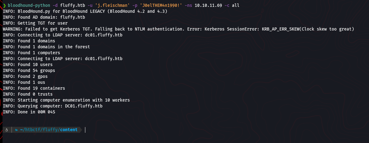 bloodhound-python -d fluffy.htb -u 'j.fleischman' -p 'J0ElThEm4n1990!' -ns 10.10.11.69 -c all