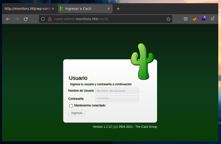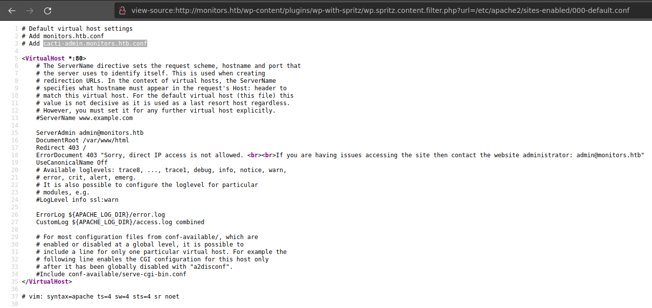 In this file, we finally find a host, so there is virtual hosting in this machine. cacti-admin.monitors.htb