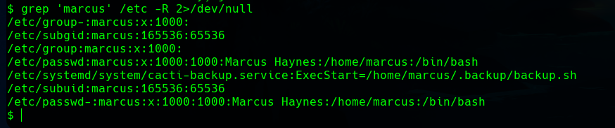 . We’d like to move into this user. With grep 'marcus' /etc -R 2>/dev/null