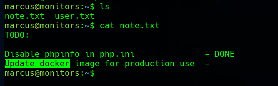 Now we have the user part of the machine, but here the machine becomes hard. Until now, it was not really difficult to find hints and exploit the vulnerabilities. The first thing we find as marcus is a To-do note in the home directory, refering to a docker image pending to update.