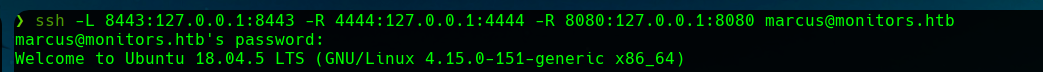 Then, we reconnect as marcus, port forwarding the port with SSH. ``ssh -L 8443:127.0.0.1:8443 -R 4444:127.0.0.1:4444 -R 8080:127.0.0.1:8080 marcus @monitors.htb`