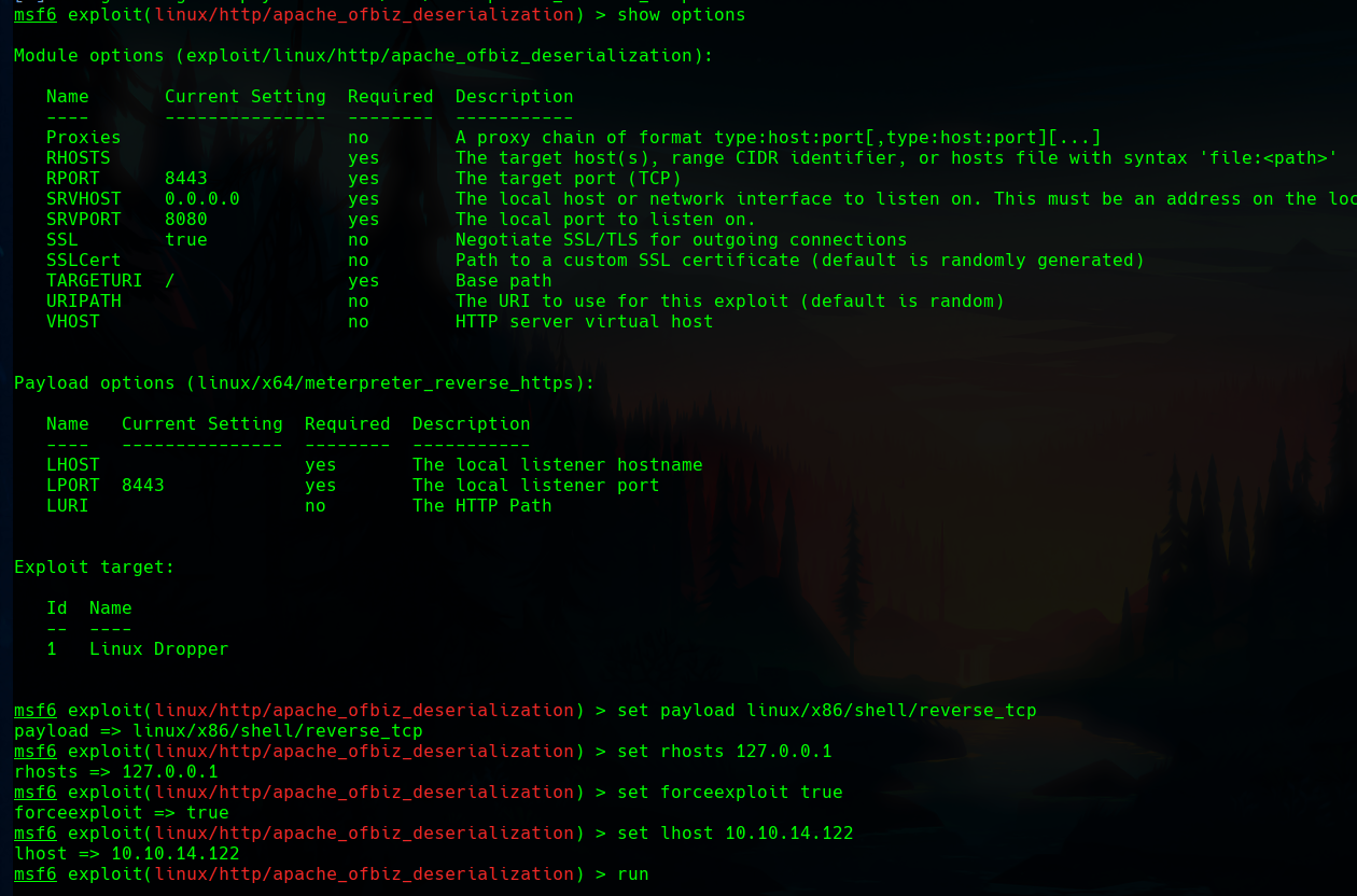If we set the options and the payload to get a reverse shell and run the exploit, we’ll end up in a docker image.