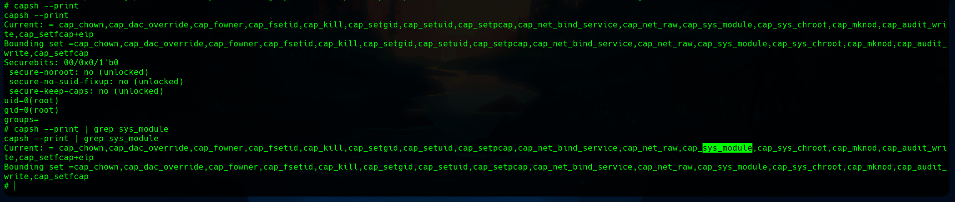 Now, we can start enumerating. We find that a Linux capability SYS_MODULE
