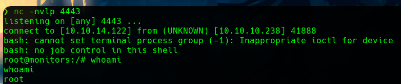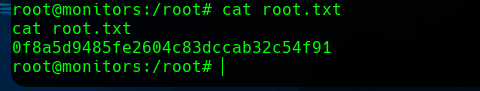 In our machine we get the shell as some many attempts, and see that we are root in the monitors machine. We have rooted the box.