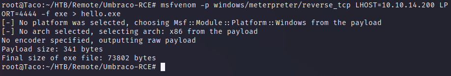 With that known, we can create a .exe payload using msfvenom, which we will upload and then use our RCE exploit to execute it and gain access to the machine.