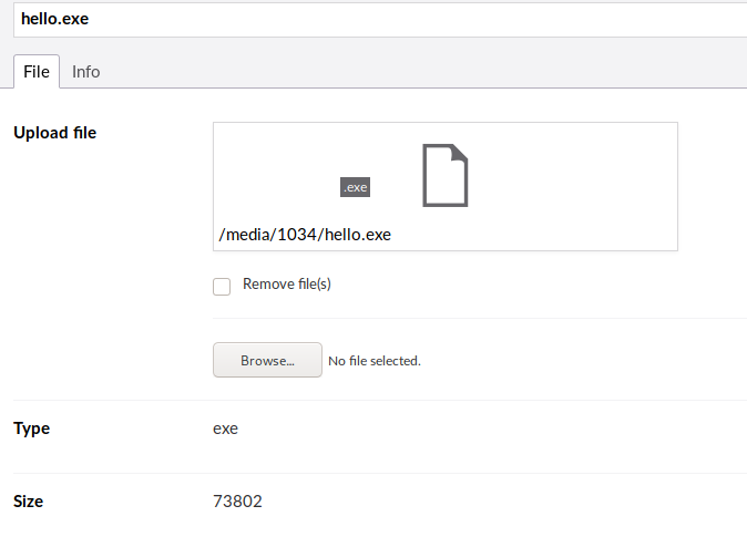 The path of the file is C:/inetpub/wwwroot/Media/1034/hello.exe