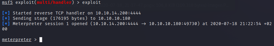 This time we will use metasploit to stablish the reverse shell, as it could be useful later to have our shell in this environment.